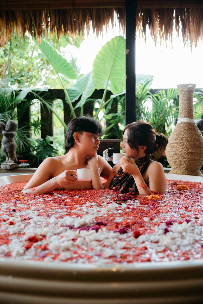 A flower bath ritual that brings peace and visual beauty into one experience. Soak in a bathtub filled with tropical petals and natural aromas while enjoying the rice field view—ideal for self-care or romantic photo sessions.